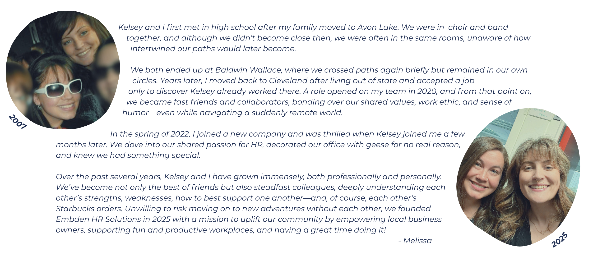two local HR professionals, friends, and self-proclaimed silly geese who believe that great HR doesn’t have to feel cold or corporate. After years of navigating the ins and outs of people operations, we started Embden HR to offer something different: